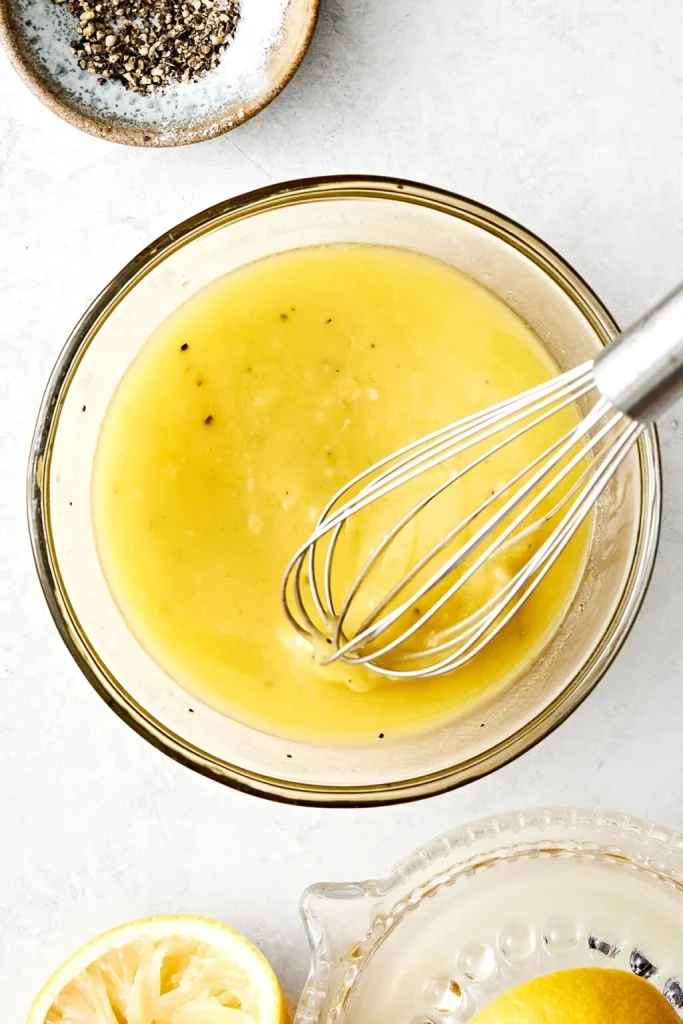 Continue whisking until the dressing becomes well blended and slightly thickened. The Dijon mustard helps stabilize the mixture so the oil and lemon juice stay combined longer.