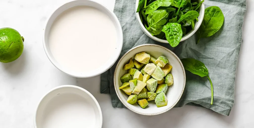 Add the chopped frozen avocado, fresh spinach leaves, and freshly squeezed lime juice to the blender. The spinach gives your smoothie a beautiful green hue and adds a boost of vitamins A and K.
