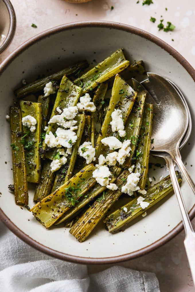 Place the baking sheet in the oven and roast for 25–30 minutes, flipping the celery halfway through. The edges should be lightly browned and the centers tender.