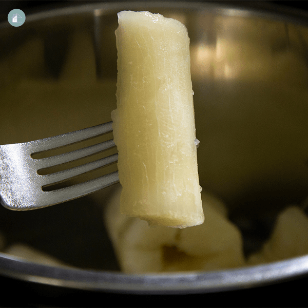 Peel and cut the yucca into fry-shaped sticks. Next, in a pot, bring 1 cup of water to a boil and add the yucca. Boil for 10–12 minutes to soften slightly. Drain well.