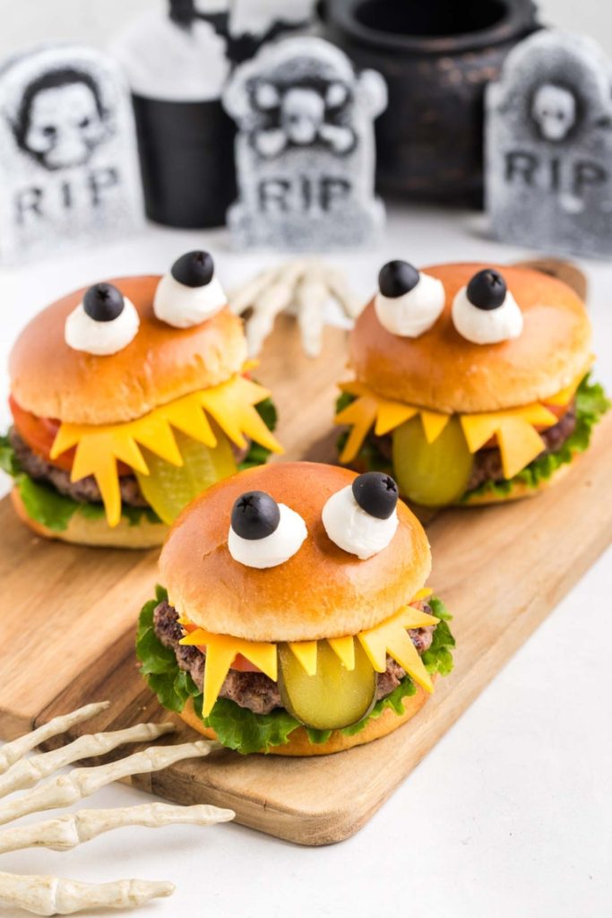 Besides the mozzarella-and-olive eyes, you can cut jagged teeth shapes into the cheddar cheese slices so they hang over the burger edge, or use ketchup and mustard creatively to draw “scars” or “monster mouths.”