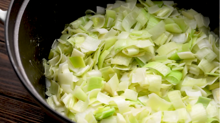 Keep the heat moderate while sautéing. If the leeks brown too much, they’ll give the soup a bitter taste and alter its signature pale color.