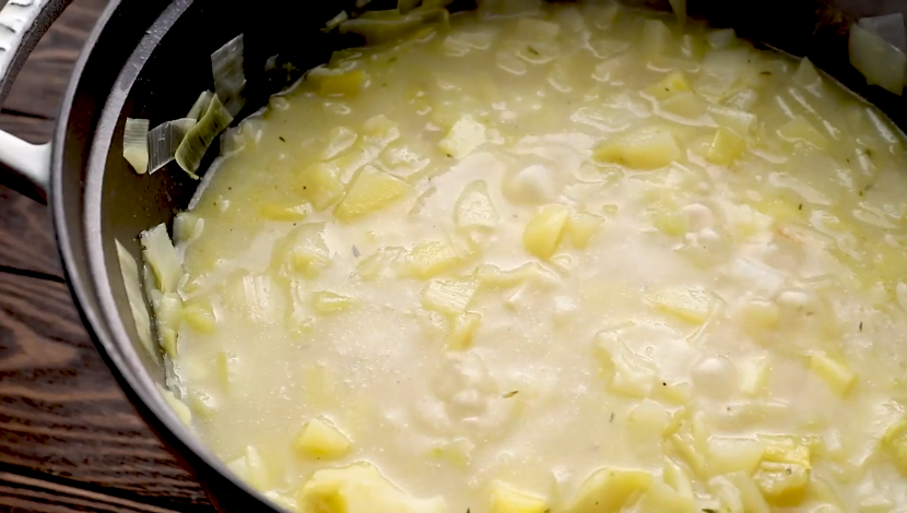 Reduce the heat to low and let the soup simmer, uncovered, for about 25–30 minutes, or until the potatoes are completely tender when pierced with a fork. The leeks should also be soft and fragrant at this point.