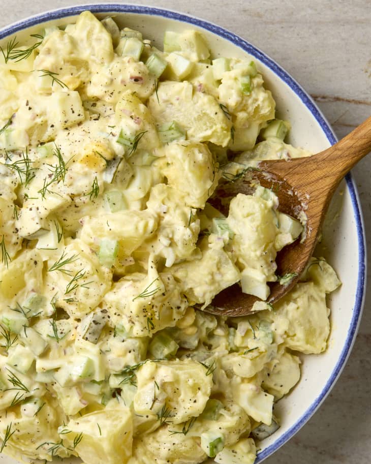 Choose the right potatoes: Waxy potatoes like Yukon Gold or red potatoes hold their shape best after boiling. Russets tend to crumble and make the salad too mushy.